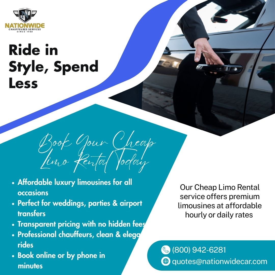 Experience luxury without breaking the bank with Cheap Limo Rental from Nationwide Chauffeured Services. Perfect for weddings, proms, airport transfers, or special events, we offer elegant limousines at affordable prices. Enjoy professional chauffeurs, clean interiors, and on-time service for every ride. Our mission is to deliver top-quality transportation that fits your budget without compromising comfort or class.