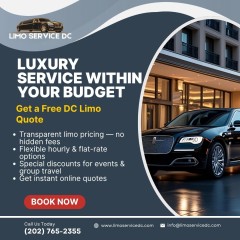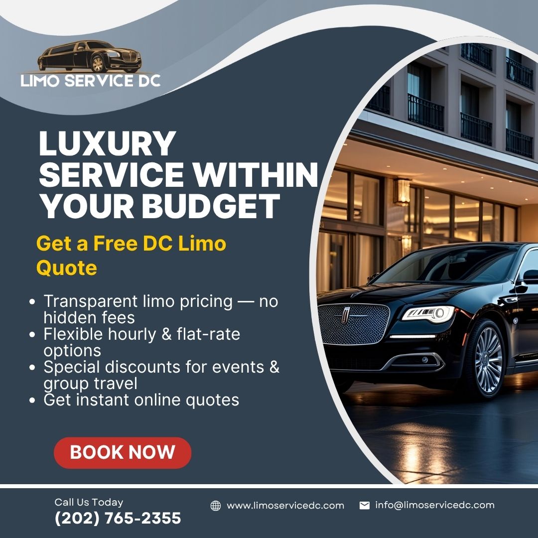 Wondering about DC Limo Service Cost? At Limo Service DC, we offer transparent and affordable pricing for luxury rides. Whether you need hourly limo rentals or airport transfers, our rates are designed to fit every budget without compromising quality. Enjoy professional chauffeurs, elegant vehicles, and unmatched comfort at the best value in DC. We make luxury transportation accessible for weddings, proms, business trips, and city tours. Request your personalized quote today for unbeatable limo service pricing!