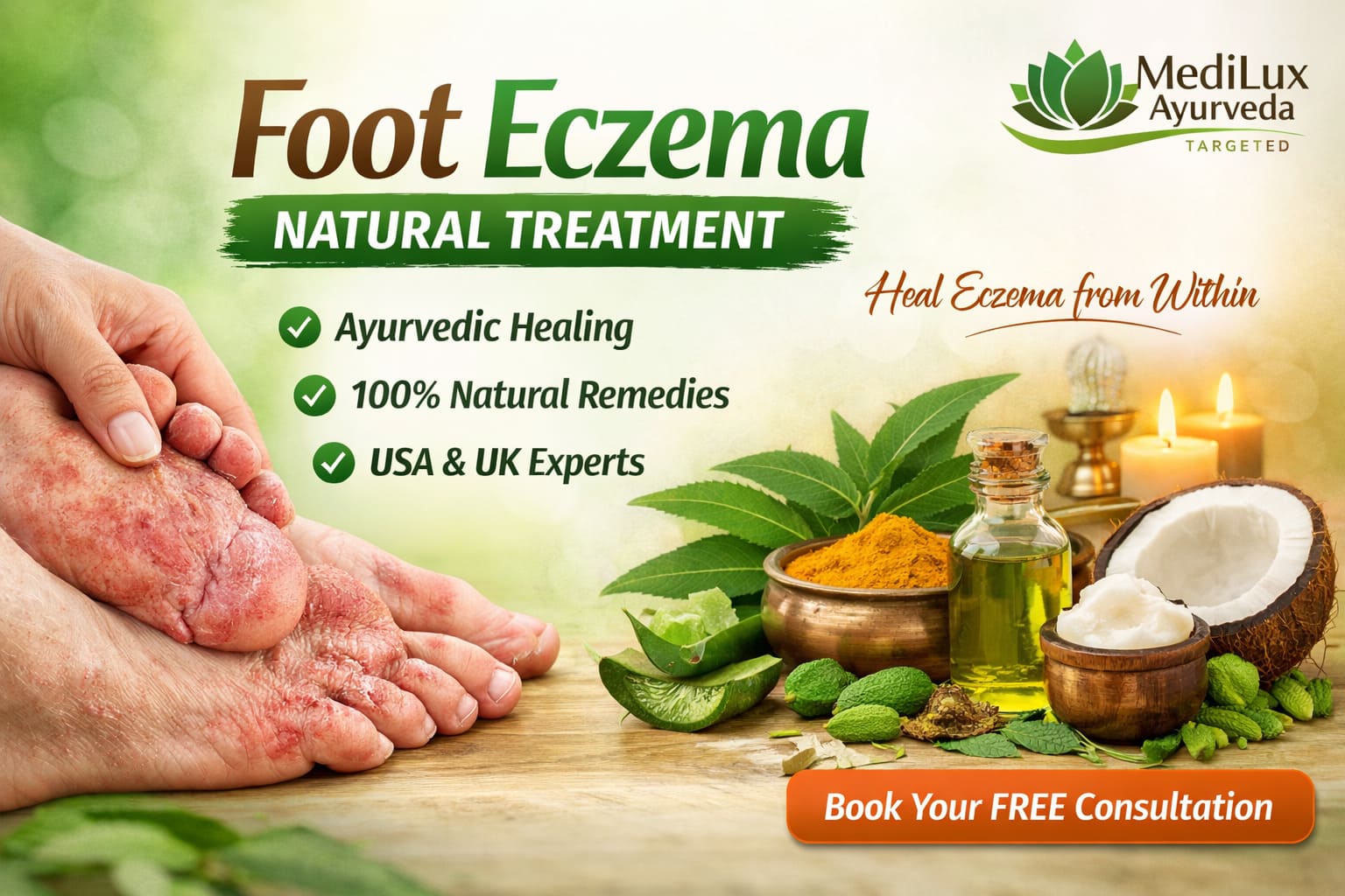 Get relief from itchy, dry, and cracked feet with MediLux Ayurvedas for foot eczema natural treatment. Safe, herbal solutions designed for long-term healing in the USA & UK. Book your free consultation today and restore healthy skin naturally.