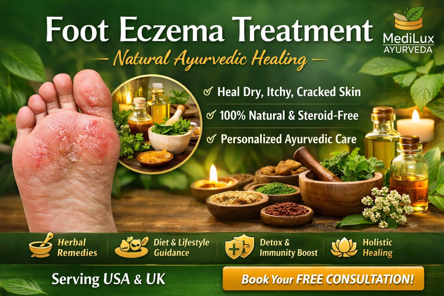 Struggling with foot eczema, itching, or cracked skin? MediLux Ayurveda offers 100% natural and Ayurvedic treatment for long-lasting relief. Trusted by patients in the USA & UK. Book your FREE consultation today and heal your skin safely without steroids!