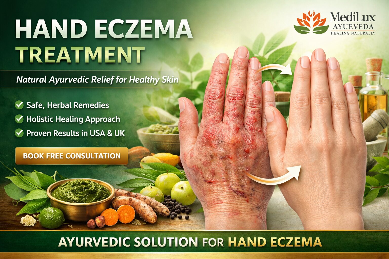 Struggling with hand eczema, itching, or dry cracked skin? MediLux Ayurveda offers natural, steroid-free treatment for long-term relief from hand eczema in the USA & UK. Book your FREE consultation today and heal your skin the Ayurvedic way!