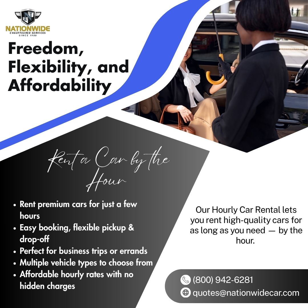 ???? Book your hourly car rental now and travel smarter with Nationwide Chauffeured Services!