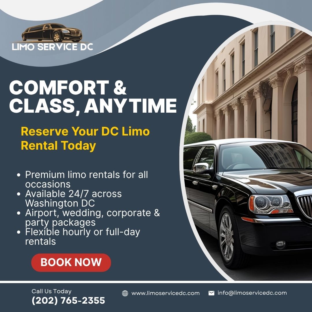 Make every occasion unforgettable with Limo Rental DC from Limo Service DC. We offer elegant and spacious limousines perfect for weddings, corporate events, airport transfers, and parties. Our professional chauffeurs deliver reliable, on-time, and comfortable transportation tailored to your schedule. Choose from our fleet of stretch limos, SUVs, and sedans at affordable hourly or daily rates. Ride in style across the capital and elevate your event with a touch of luxury and sophistication.