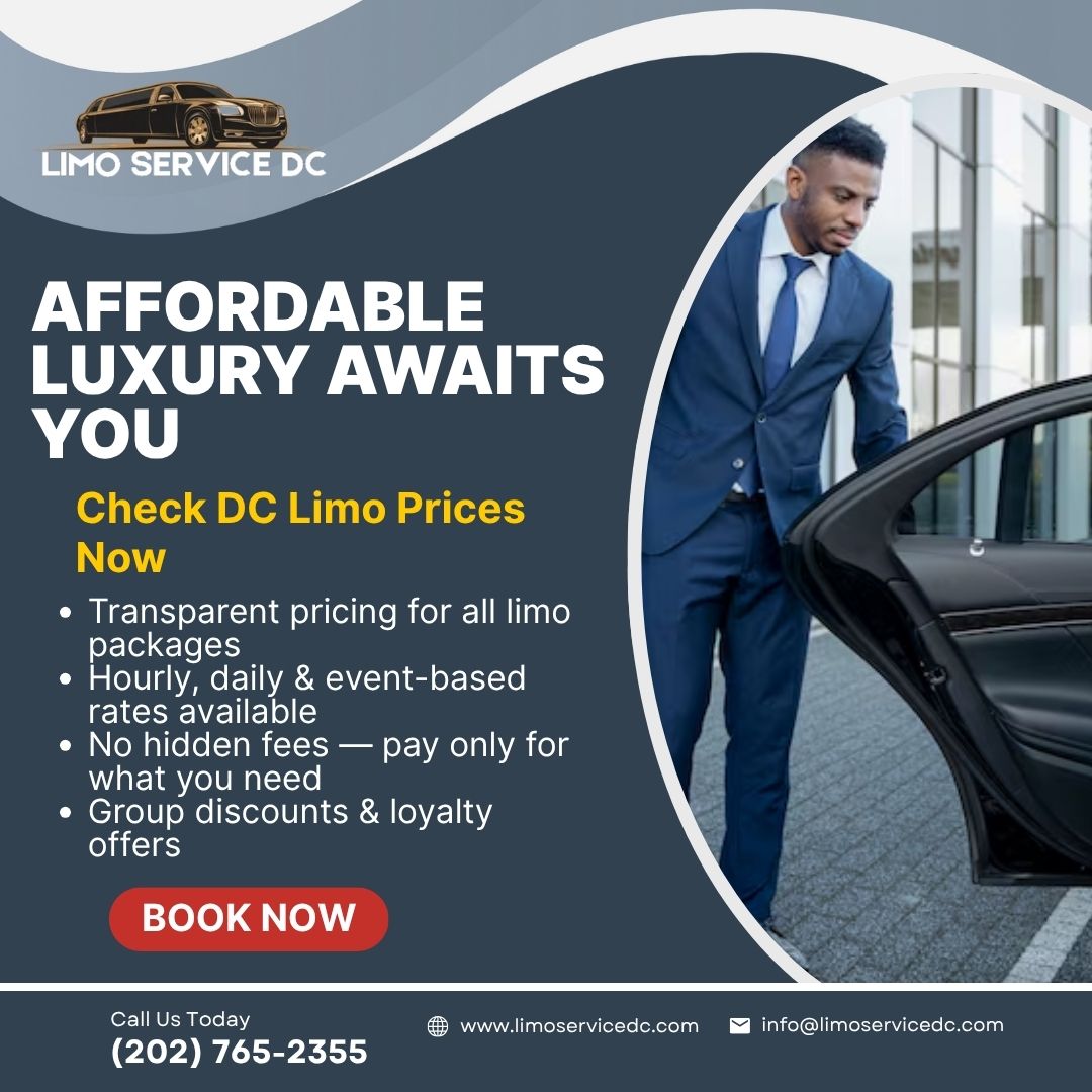 Discover unbeatable Limo Service DC Prices with Limo Service DC. We offer flexible, transparent rates on premium limousine rentals for weddings, airport transfers, and corporate events. Our affordable hourly packages and customized deals make luxury transportation accessible to everyone. Enjoy elegant rides, professional chauffeurs, and a smooth booking process. Compare our prices and see why were the go-to limo company in Washington DC for affordable, top-quality service.