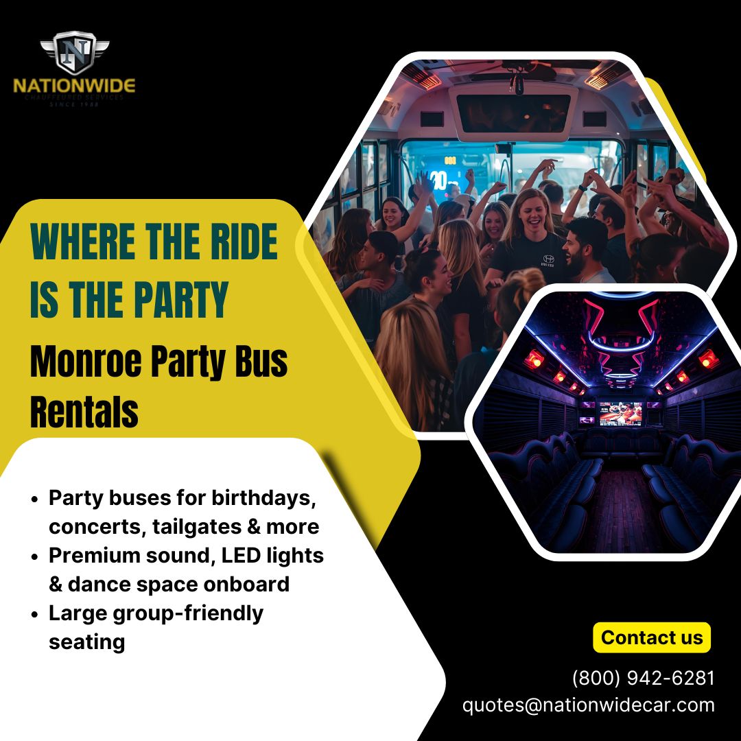 Celebrate in style with Party Bus Rental Monroe from Nationwide Chauffeured Services. Our party buses are perfect for birthdays, weddings, proms, and group outings, offering spacious interiors, lighting, music, and modern amenities to keep the fun going. Travel together with friends and family while our professional chauffeurs handle the driving safely and punctually. With affordable packages and flexible options, we make it easy to rent a party bus in Monroe for any occasion. Add excitement and luxury to your celebrations with our trusted party bus rentals.