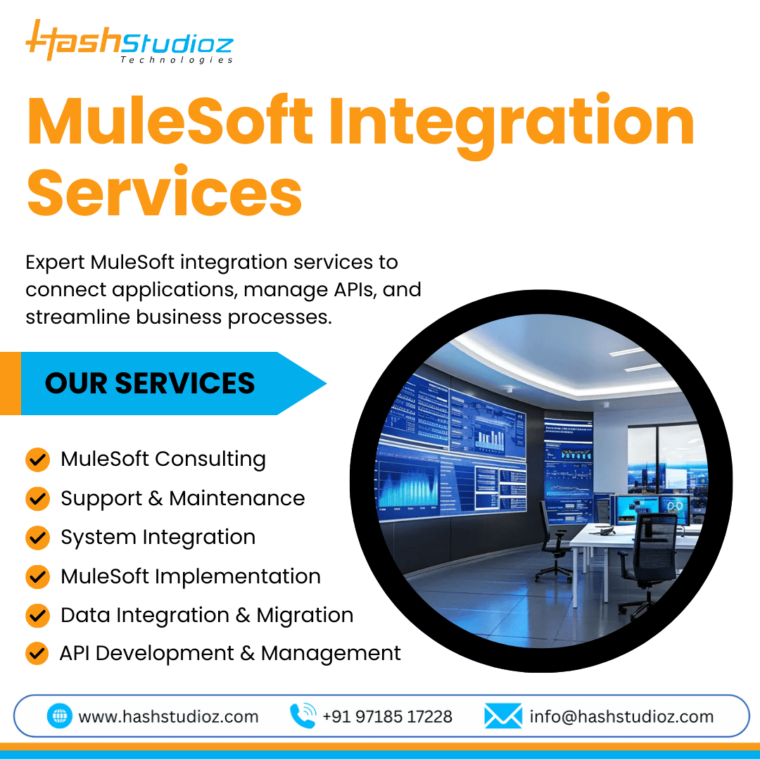 Transform your enterprise connectivity with MuleSoft Integration Services designed to connect applications, data, and systems seamlessly. Hashstudioz Technologies Company delivers scalable, secure, and future-ready MuleSoft Integration Services for businesses across the USA and Australia. We help you streamline workflows, enhance data exchange, and improve operational efficiency through robust API-led connectivity. Our certified MuleSoft experts build customized integration solutions that reduce complexity and accelerate digital transformation. Whether cloud, on-premise, or hybrid, our MuleSoft Integration Services ensure smooth communication across platforms. Partner with Hashstudioz Technologies Company to achieve faster integrations, better performance, and smarter business processes.
