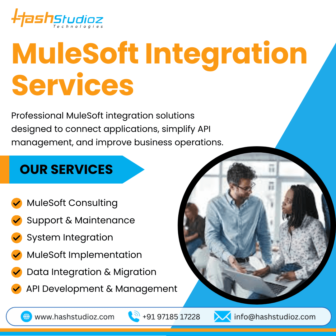 Hashstudioz Technologies Company delivers advanced MuleSoft Integration Services to help businesses connect applications, data, and systems seamlessly. Our certified experts design and implement scalable MuleSoft Integration Services that improve operational efficiency and enable real-time data flow across platforms. With deep experience in API-led connectivity, we ensure secure and flexible integrations tailored to your enterprise needs. Choosing professional MuleSoft Integration Services empowers organizations to streamline processes, reduce complexity, and accelerate digital transformation. Partner with Hashstudioz Technologies Company to unlock the full potential of connected systems and drive smarter business outcomes.