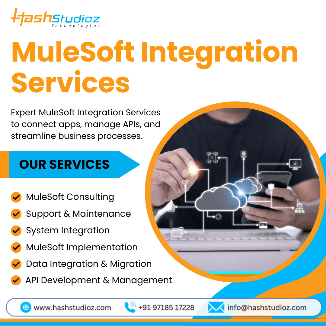 Looking for powerful MuleSoft Integration Services to streamline your systems? HashStudioz Technologies offers secure, scalable, and high-performance integration solutions for modern enterprises. As a leading provider of MuleSoft Integration Services, we help businesses across the USA and Australia connect applications, data, and platforms effortlessly. Our team ensures real-time data flow, improved interoperability, and API-led connectivity that drives business efficiency. With HashStudioz Technologies managing your MuleSoft Integration Services, you gain agility, automation, and a seamless digital ecosystem. Empower your organization with integrations designed to boost productivity and accelerate growth.