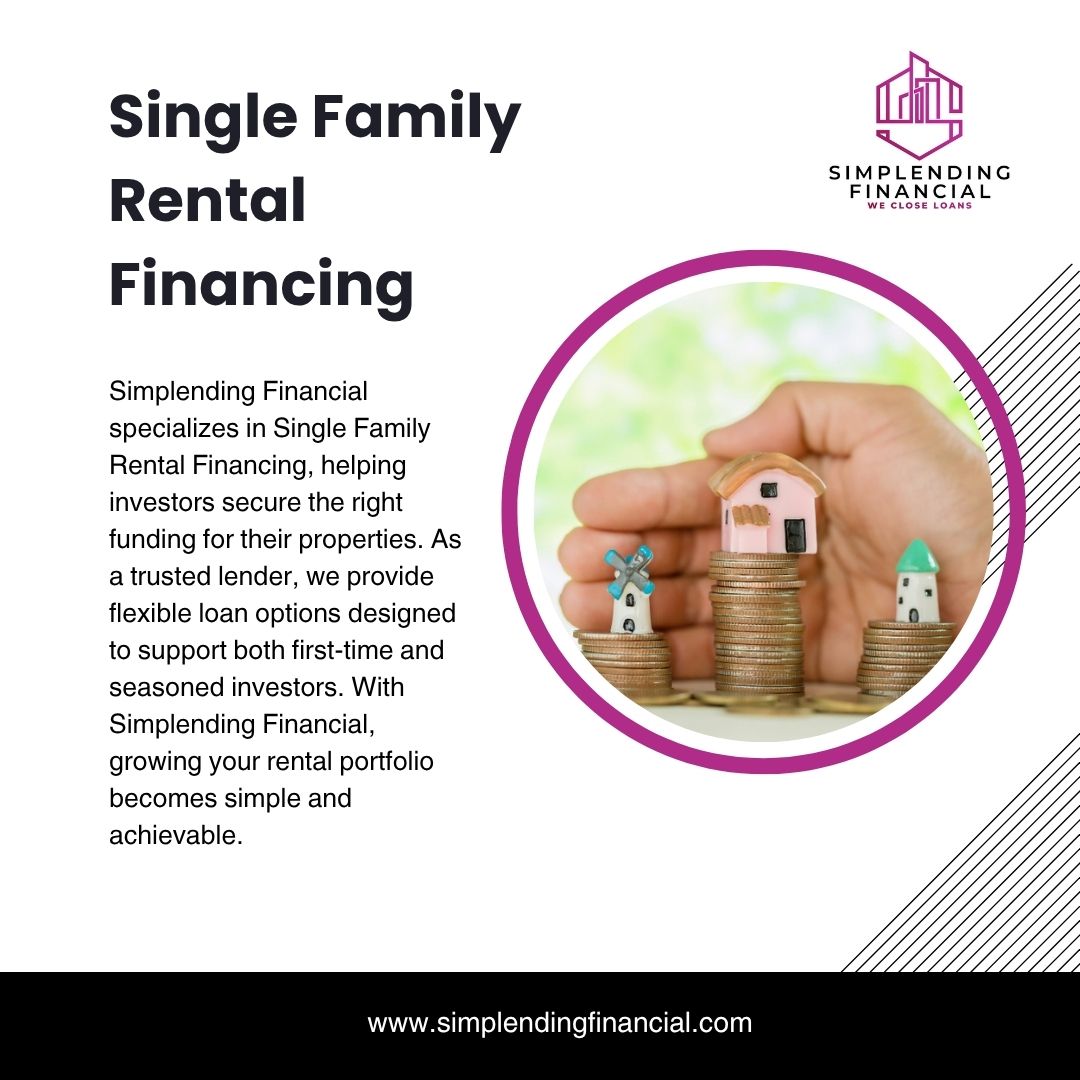 Looking to invest in rental properties? Simplending Financial specializes in Single Family Rental Financing tailored for real estate investors. Whether you're expanding your portfolio or purchasing your first rental home, we offer flexible terms, fast approvals, and competitive rates. Partner with financing experts who understand your goals. Build wealth with Simplending Financial today!