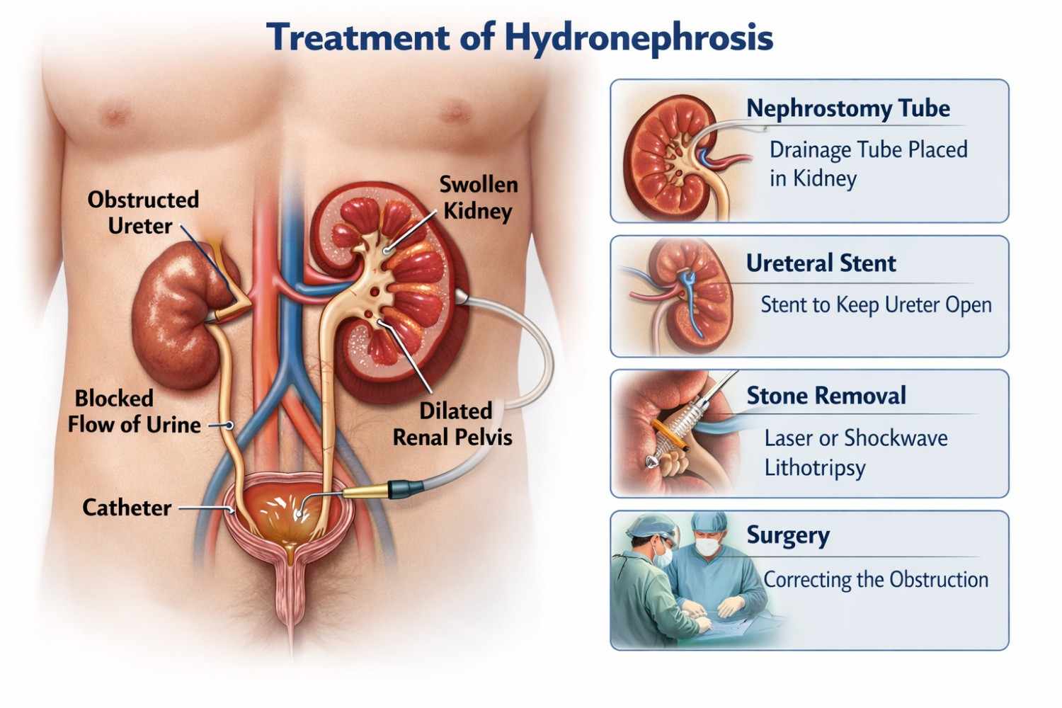 The treatment approach depends on the cause and severity of the condition. In mild cases, doctors may recommend monitoring the patients condition along with medications to manage pain or treat infections. If hydronephrosis is caused by kidney stones, treatment may involve increasing fluid intake, medications, or medical procedures to remove the stones. In more severe cases, doctors may place a ureteral stent or a nephrostomy tube to help drain urine from the kidney and reduce pressure. Sometimes surgery may be required to correct structural problems in the urinary tract. Proper medical care can help restore normal kidney function and prevent further complications.