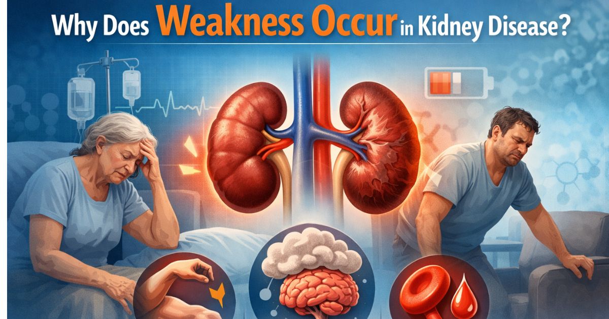 Weakness in kidney disease occurs because damaged kidneys cannot properly filter waste or maintain essential body functions. Reduced production of erythropoietin leads to anemia, lowering oxygen supply and causing fatigue. The buildup of toxins in the blood makes the body feel tired and sluggish. Electrolyte imbalances and protein loss also affect muscle strength. Additionally, poor appetite, sleep problems, and fluid imbalance further contribute to low energy levels and overall physical weakness.