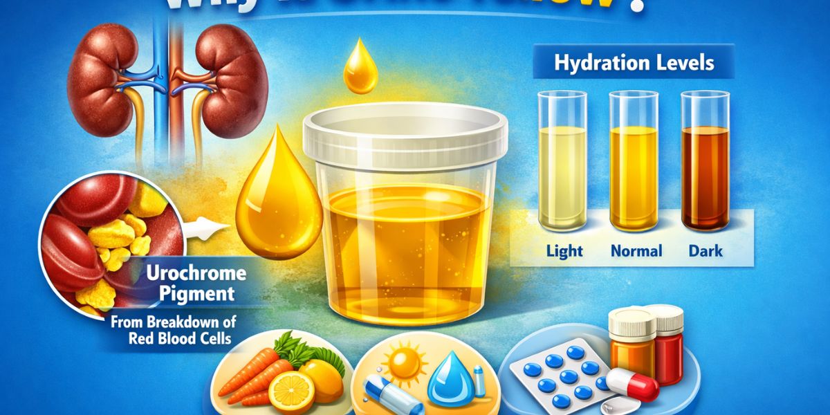 Why is Urine yellow mainly because of a pigment called urochrome, which is produced when the body breaks down old red blood cells. The color can vary from pale yellow to dark amber depending on how hydrated you are. Drinking plenty of water makes urine lighter, while dehydration makes it darker. Certain foods, vitamins, and medications can also change the color. Usually, yellow urine is a normal and healthy sign of proper kidney function.